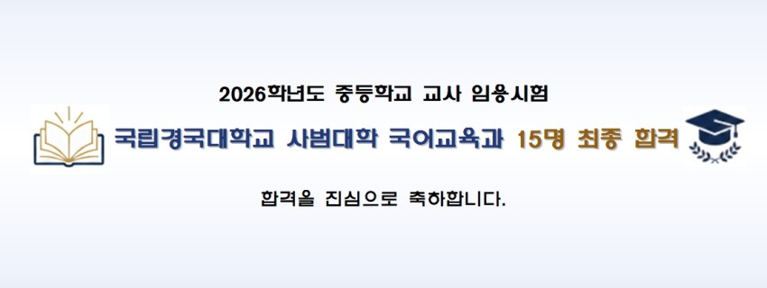 - 2025-1230경상남도 소재 중학교 교사안녕하세요. 저는 국어교육과 졸업생 OOO입니다. 현재 저는 중등교사 임용시험에 합격해 교단에 서 있습니다. 저도 항상 취업 수기나 합격 수기를 읽으며 마음을 다잡고 임용 준비를 했기 때문에 이렇게 취업 수기를 통해 후배들에게 도움이 될 수 있다면 영광이라 생각됩니다. 저는 임용시험을 준비하는 과정에 대학과 학과에서 많은 지원을 받으면서 공부를 했습니다. 후배들도 임용시험을 준비하면서 대학과 학과에서 운영하는 다양한 지원 프로그램의 도움을 받기를 바라며 이를 중심으로 소감을 말씀드리겠습니다.